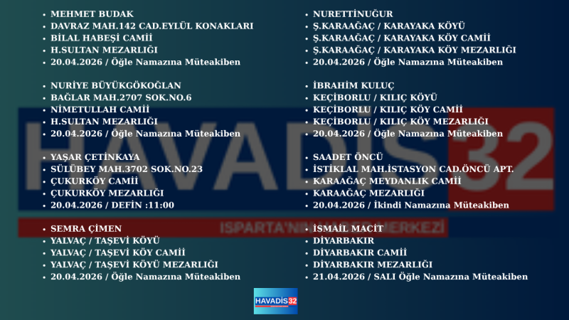 20 NİSAN 2026 PAZARTESİ ISPARTA'DA BUGÜN VEFAT EDENLER.